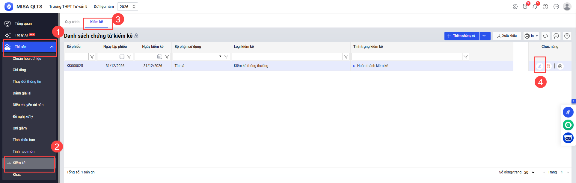 - Bước 1: Tại thanh menu bên trái, chọn phân hệ Tài sản, chọn Kiểm kê và nhấn Sửa (biểu tượng hình chiếc bút cuối kỳ).