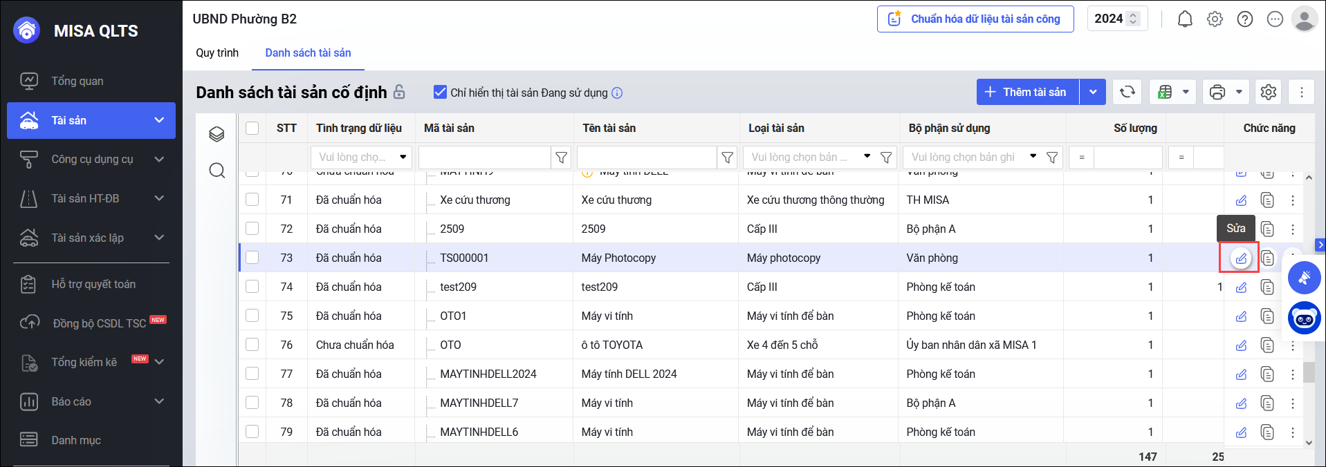 Bước 1: Trên danh sách chọn tài sản cần sửa, sau đó kích chuột vào biểu tượng bút Sửa
