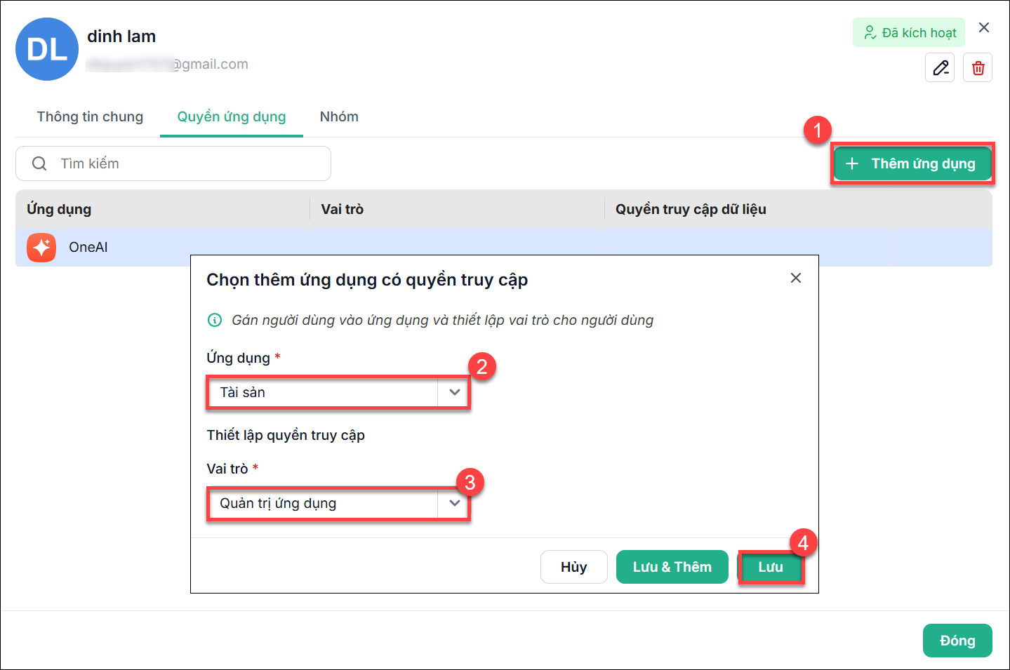 Bước 6: Nhấn Thêm ứng dụng\ chọn ứng dụng Tài sản\chọn Vai trò tương ứng sau đó nhấn Lưu.