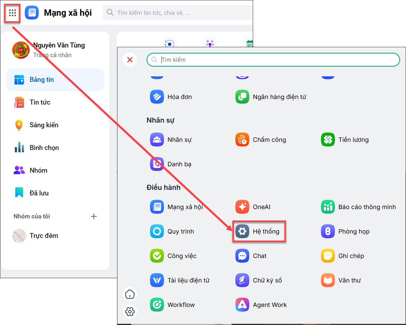 Bước 2: Nhấn vào biểu tượng chính dấu chấm góc trái trên cùng màn hình, chọn ứng dụng Hệ thống