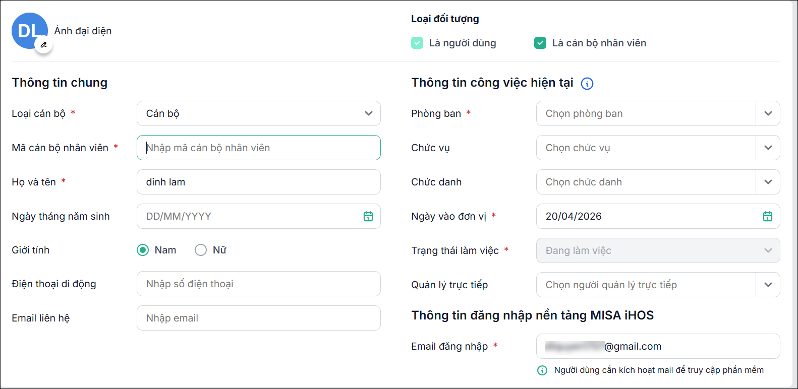 • Tích Là cán bộ nhân viên nếu người dùng là cán bộ nhân viên.