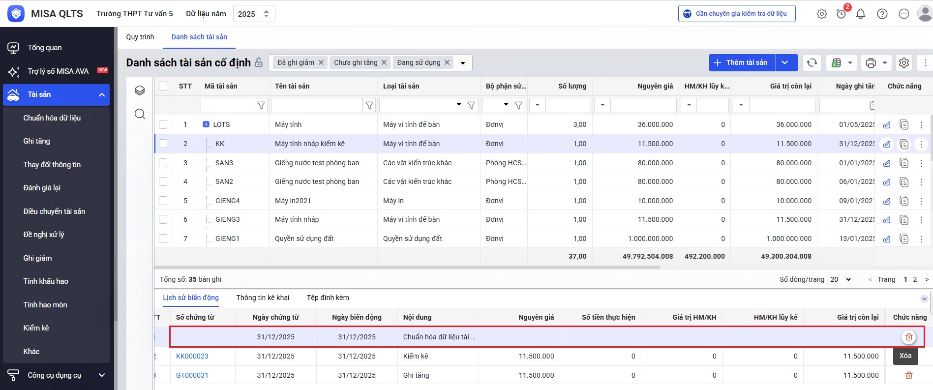 - Tìm đến hình Thùng rác cuối dòng chuẩn hóa tại Lịch sử biến động của TSCĐ để xóa