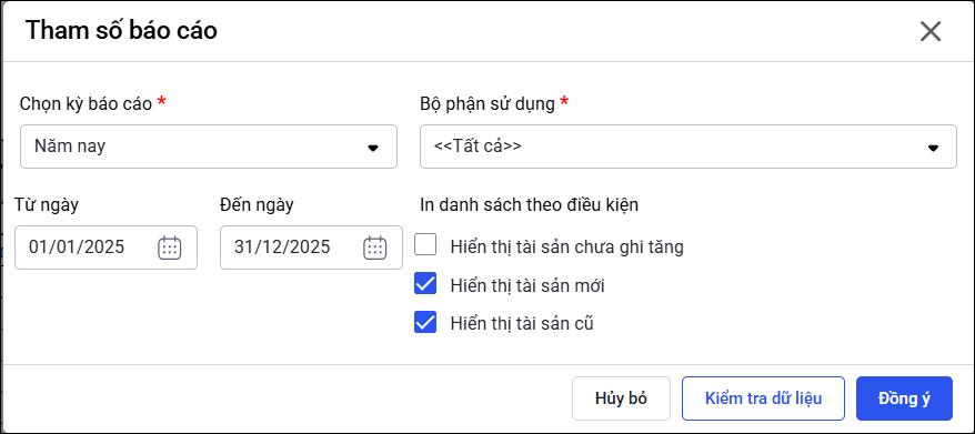 Lưu ý: Trường hợp anh/chị cần cần xuất danh sách TSCĐ có đầy đủ thông tin đặc thù (gồm năm sản xuất, nước sản xuất, nhãn hiệu, số seri, model, diện tích, thể tích, người sử dụng) thì vui lòng tham khảo bài viết khác tại đây.