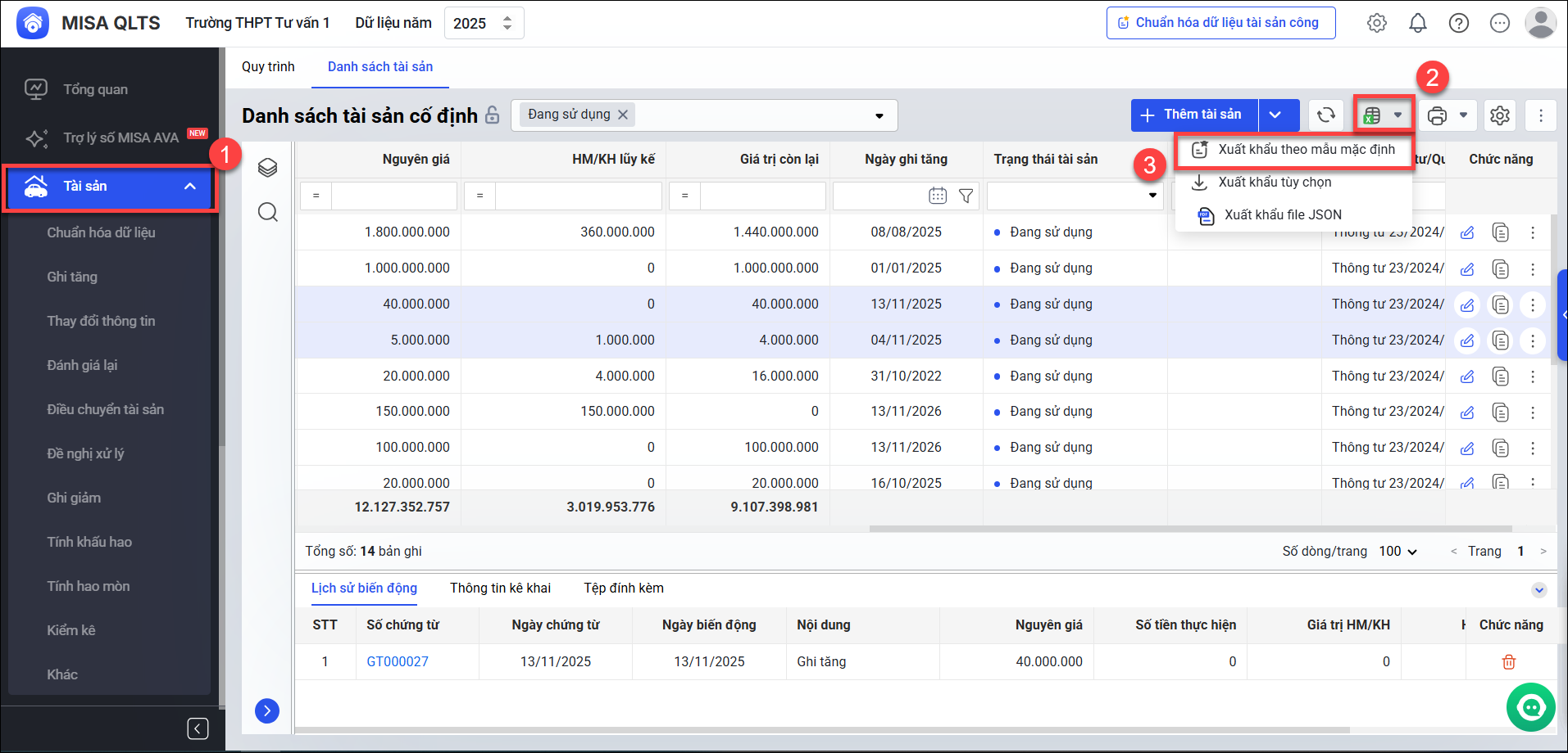 Trường hợp 2: Đơn vị muốn xuất khẩu danh sách tài sản chi tiết để lưu trữ tại đơn vị
