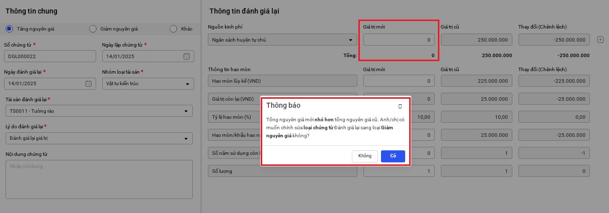 Thông báo “Tổng nguyên giá mới nhỏ hơn tổng nguyên giá cũ. Anh/chị có muốn chỉnh sửa loại chứng từ Đánh giá lại sang loại Giảm nguyên giá không?” xuất hiện là do anh/chị đang chọn hình thức Tăng nguyên giá nhưng lại nhập Giá trị mới nhỏ hơn Giá trị cũ của tài sản.