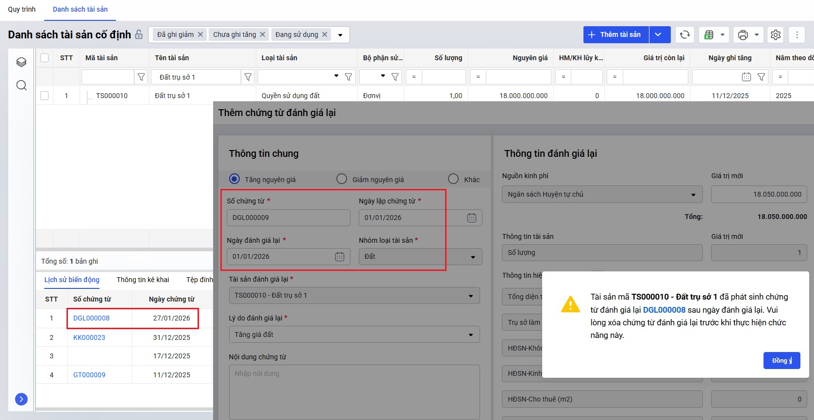 Khi thực hiện nghiệp vụ Đánh giá lại tài sản cố định, nếu phần mềm báo lỗi “Tài sản mã … đã phát sinh chứng từ … sau ngày đánh giá lại. Vui lòng xóa chứng từ đánh giá lại trước khi thực hiện chức năng này” thì nguyên nhân thường do tài sản đã có chứng từ phát sinh sau thời điểm đánh giá lại.
