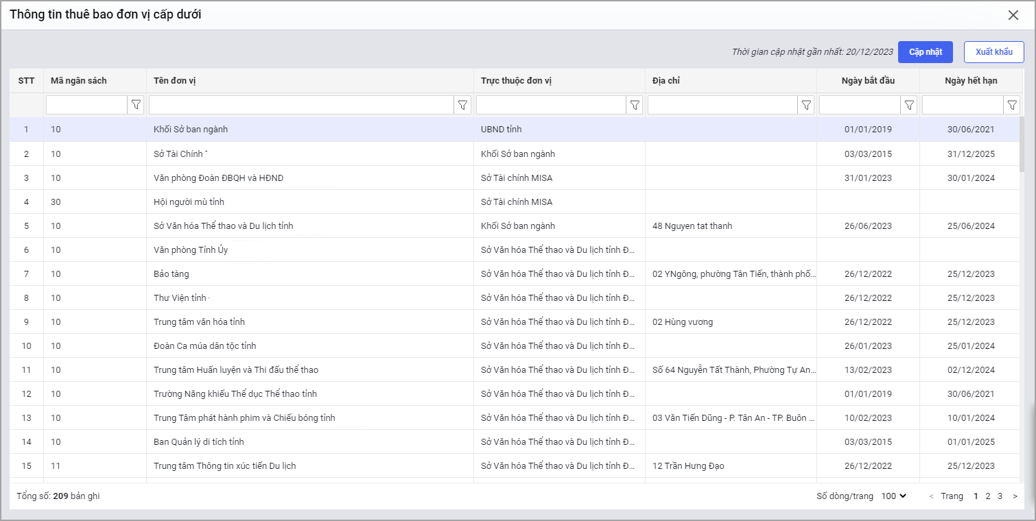 • Phần mềm sẽ hiển thị các thông tin bao gồm: Mã Ngân sách, Tên đơn vị, Trực thuộc đơn vị, Địa chỉ, Ngày bắt đầu, Ngày hết hạn.
