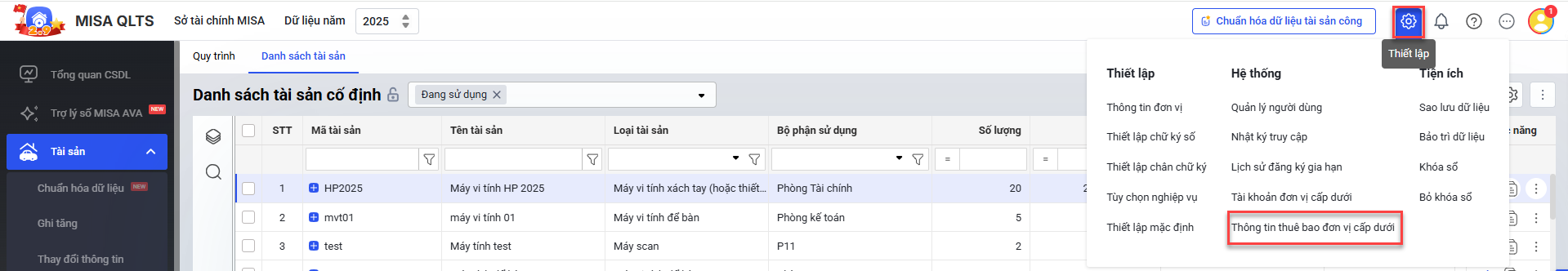• Chọn Thiết lập\ Thông tin thuê bao đơn vị cấp dưới.