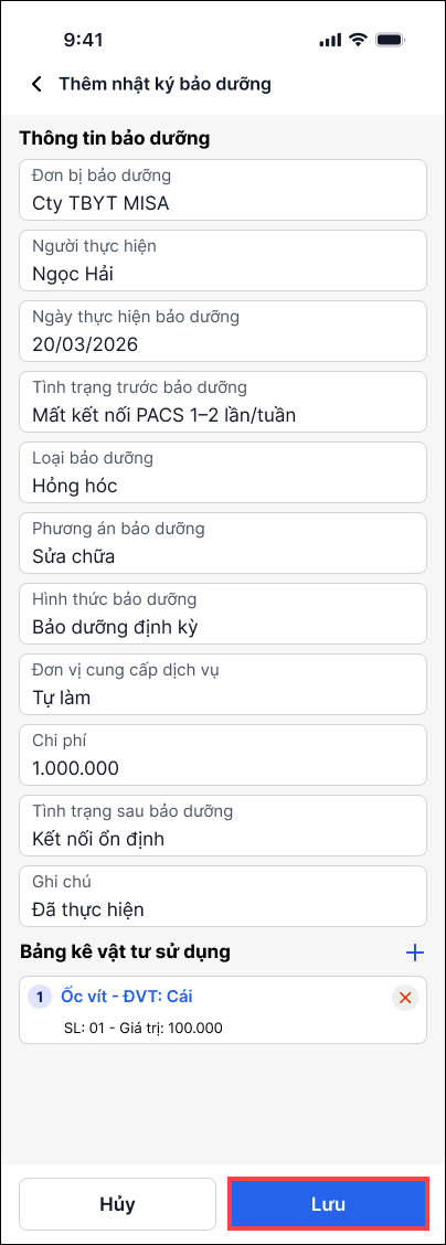 Lập phiếu bảo dưỡng trên ứng dụng iHOS Tài sản mobile