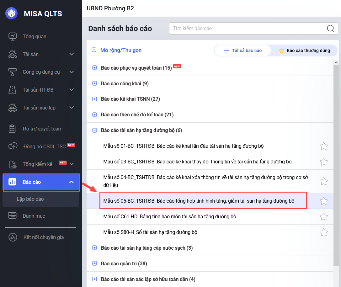 Bước 1: Vào menu Báo cáo\Báo cáo tài sản hạ tầng đường bộ. Tại đây phần mềm đã bổ sung Mẫu số 05-BC-TSHTĐB: Báo cáo tổng hợp tình hình tăng, giảm tài sản hạ tầng đường bộ.