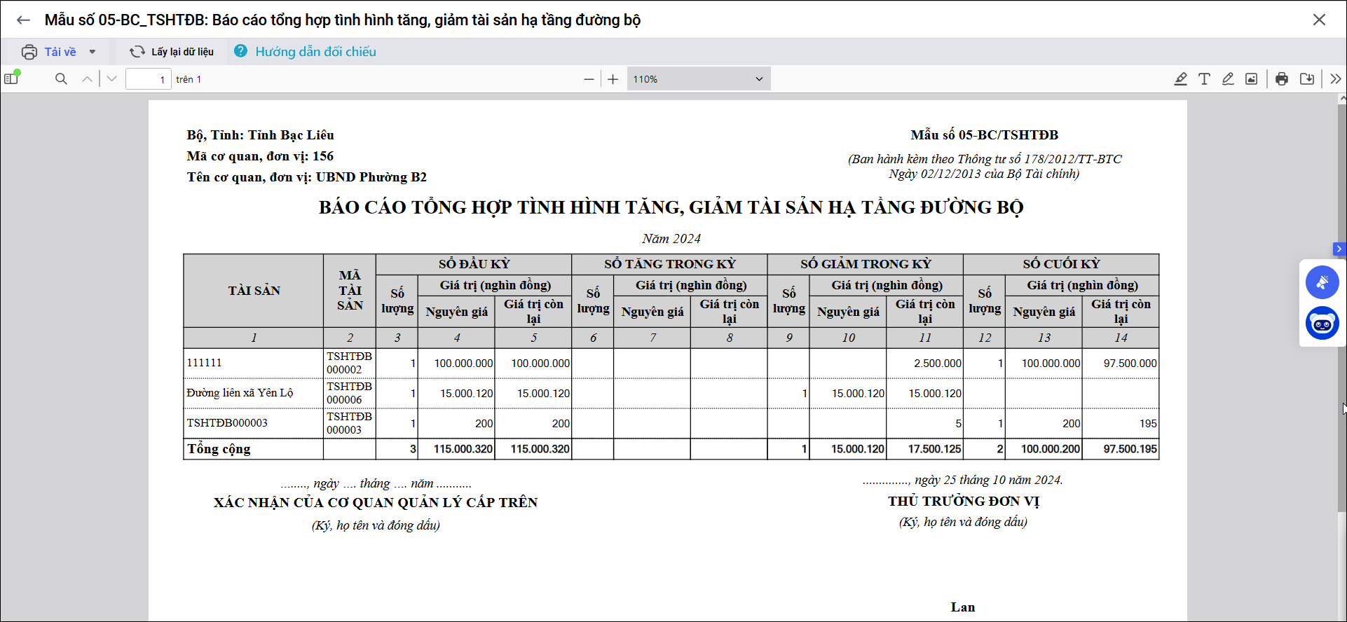 - Kích đúp chuột vào Mẫu số 05-BC-TSHTĐB: Báo cáo tổng hợp tình hình tăng, giảm tài sản hạ tầng đường bộ.
