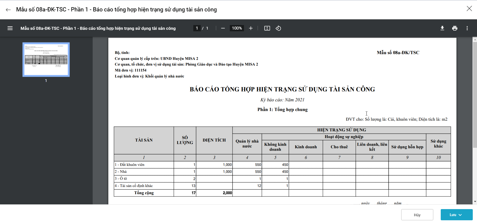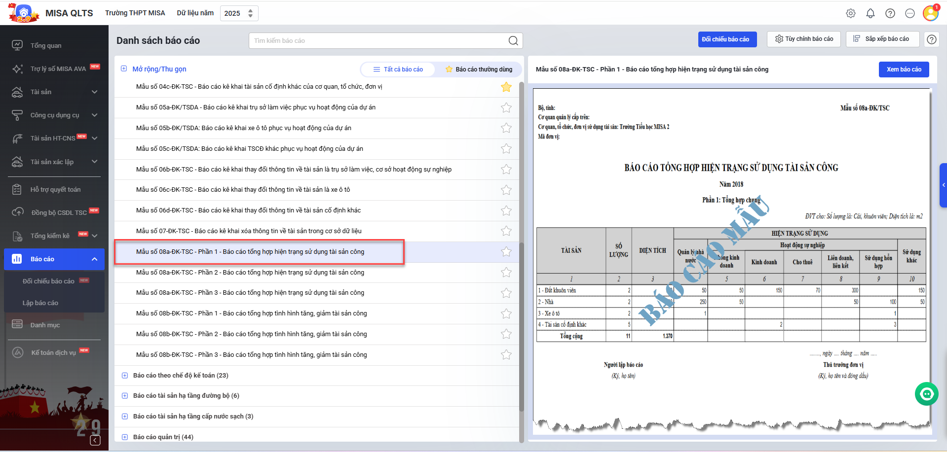 Bài viết giới thiệu tính năng mới giúp anh/chị in được Mẫu số 08a-ĐK-TSC – Phần 1 – Báo cáo tổng hợp hiện trạng sử dụng tài sản công (mẫu 08a phần 1).