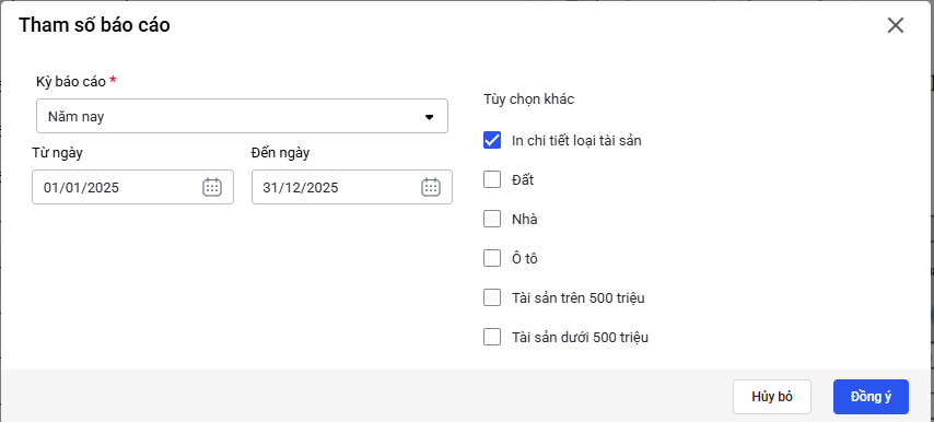 • Cách 2: Trường hợp muốn in chi tiết theo loại tài sản, anh/chị bắt buộc phải tích chọn ít nhất một loại tài sản cần xem (Đất, Nhà, Ô tô,…).