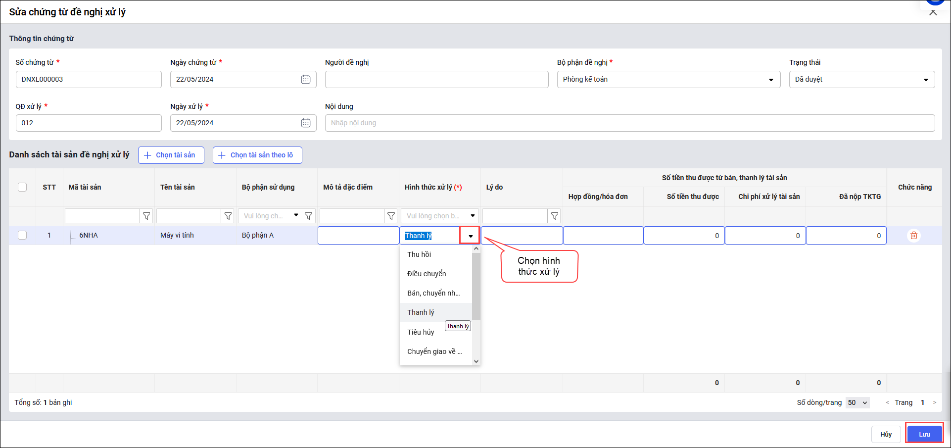 - Để báo cáo lên số liệu thì cần lập chứng từ đề nghị xử lý theo hướng dẫn tại đây cho các tài sản đã được cấp trên đồng ý xử lý trong năm báo cáo.