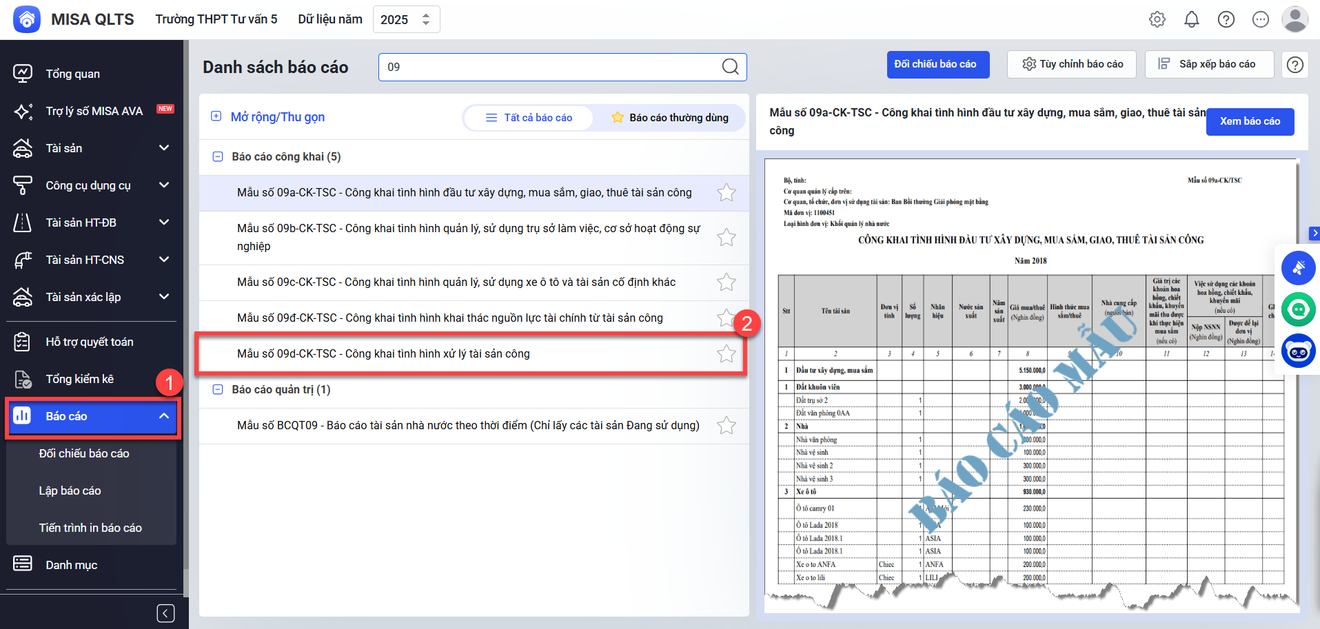 Bước 1: Để in báo cáo anh/chị vào menu Báo cáo\Báo cáo công khai. Nhấn vào báo cáo Mẫu số 09d-CK-TSC – Công khai tình hình xử lý tài sản công.