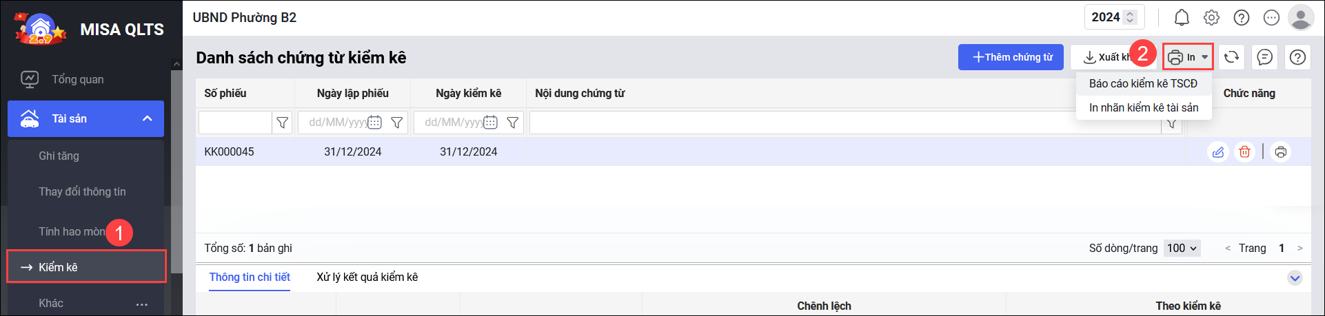 Cách 1: In trên giao diện Kiểm kê tài sản