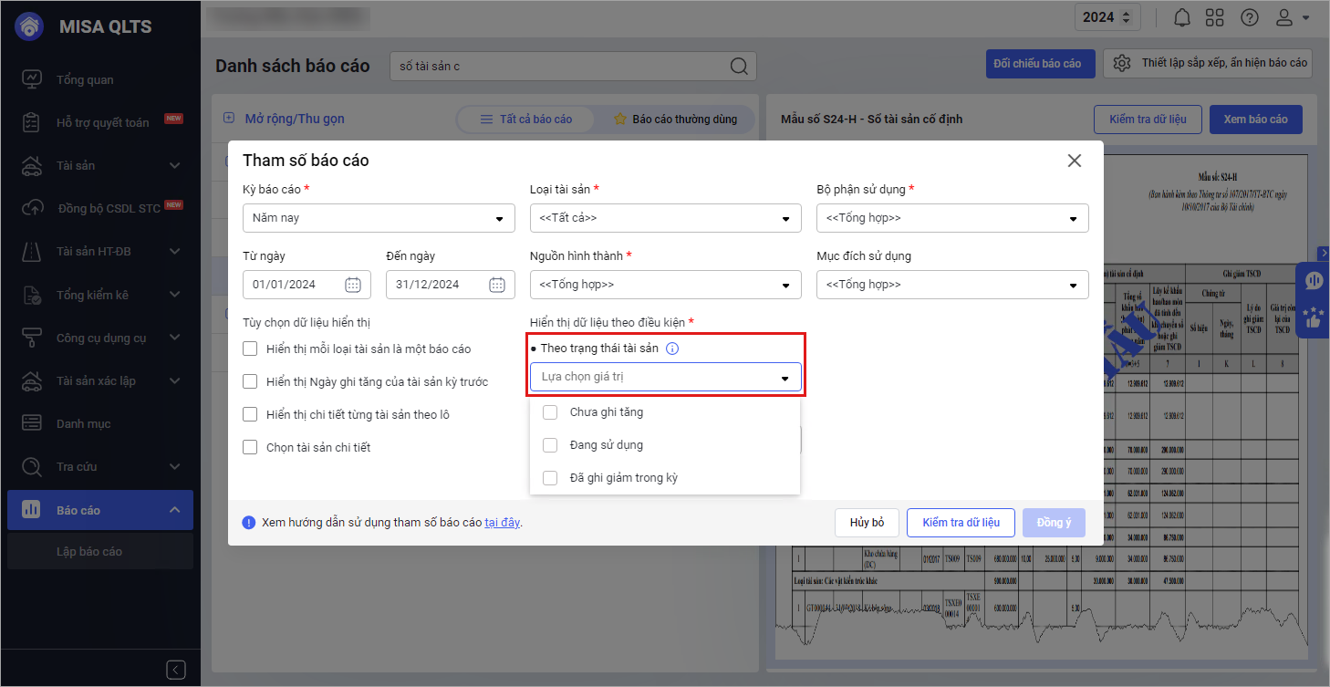 • Khi in Sổ tài sản S24-H, tại phần tham số lọc theo tình trạng tài sản, anh/chị đang tích chọn cả trạng thái “Đã ghi giảm”, nên báo cáo vẫn hiển thị các tài sản đã ghi giảm trong năm để phục vụ đối chiếu lịch sử.