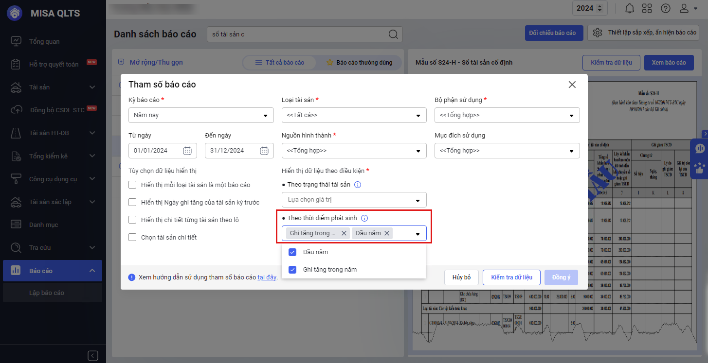 • Chọn “Tổng hợp” để hiển thị toàn bộ tài sản, không phân biệt theo nguồn hình thành (thường chọn tham số này).