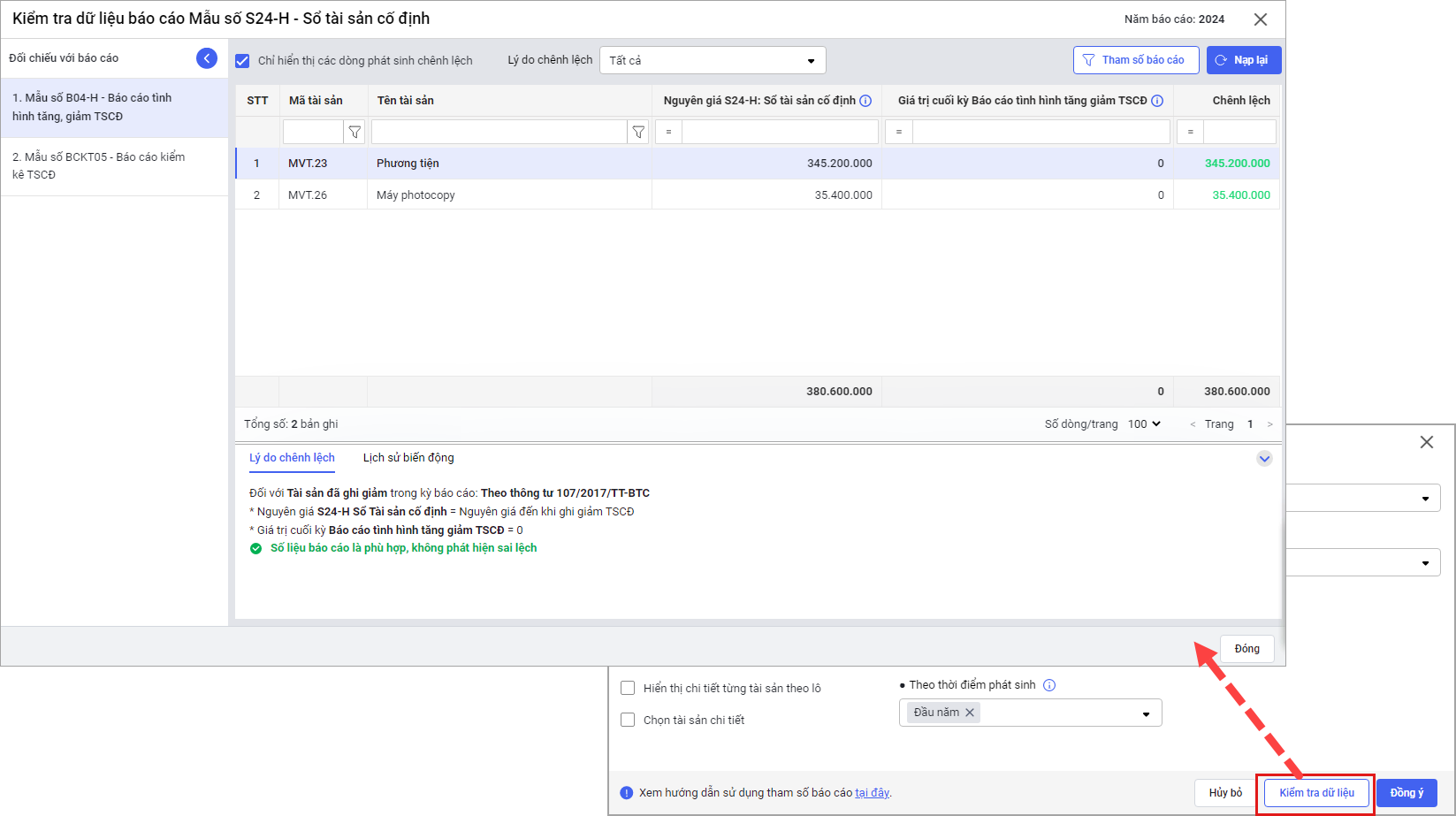 • Sau khi lựa chọn Tham số báo cáo, anh/chị chọn Kiểm tra dữ liệu phần mềm tự động kiểm tra đối chiếu báo cáo S24 – H với mẫu số B04 – H mẫu số BCKT05