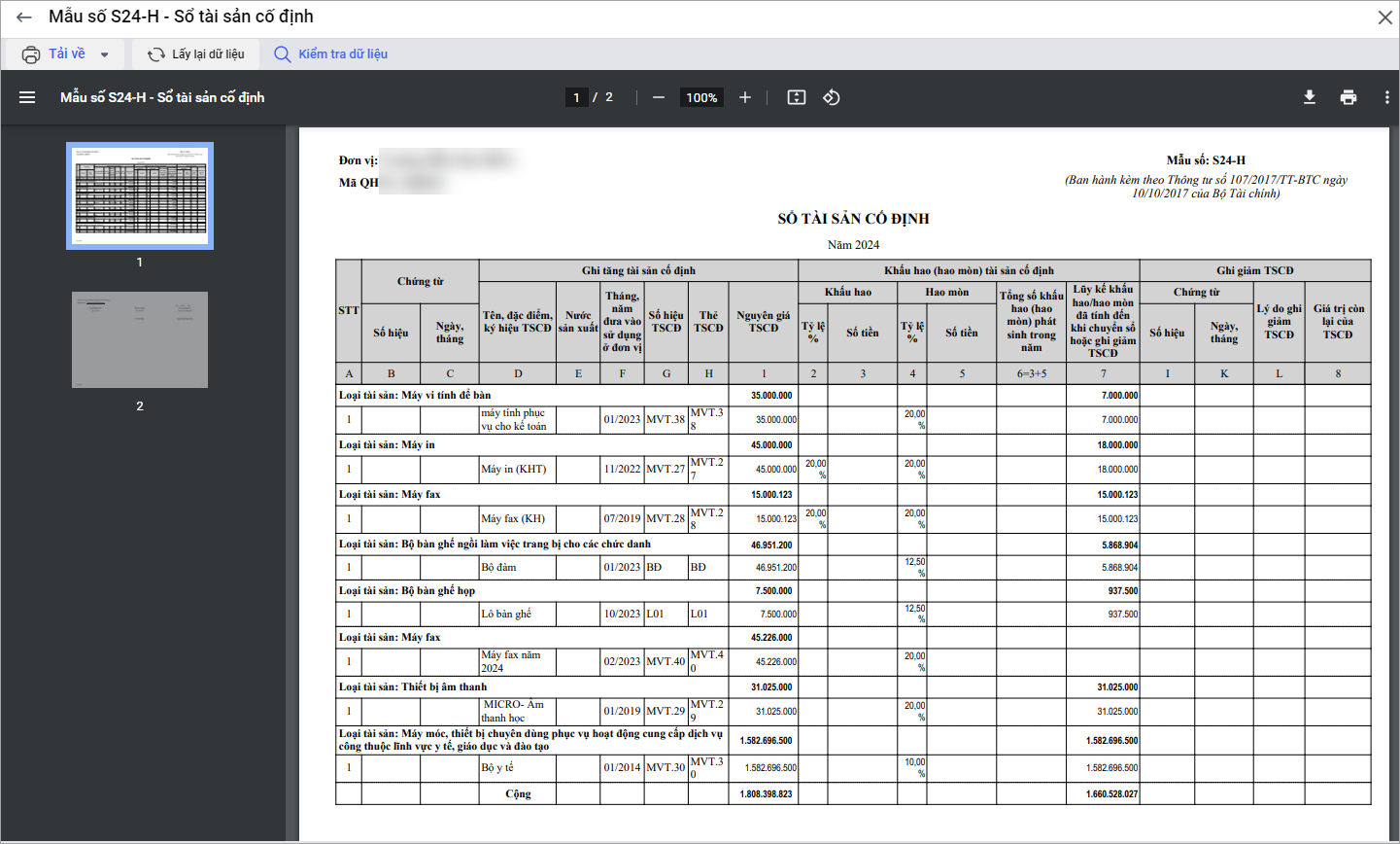 Một số vấn đề thường gặp khi in Mẫu số S24-H - Sổ tài sản cố định