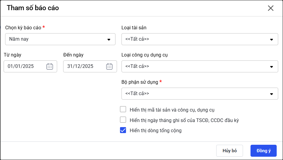 • Bộ phận sử dụng: Chọn bộ phận sử dụng tài sản/CCDC hoặc để “Tất cả” nếu muốn hiển thị toàn đơn vị.