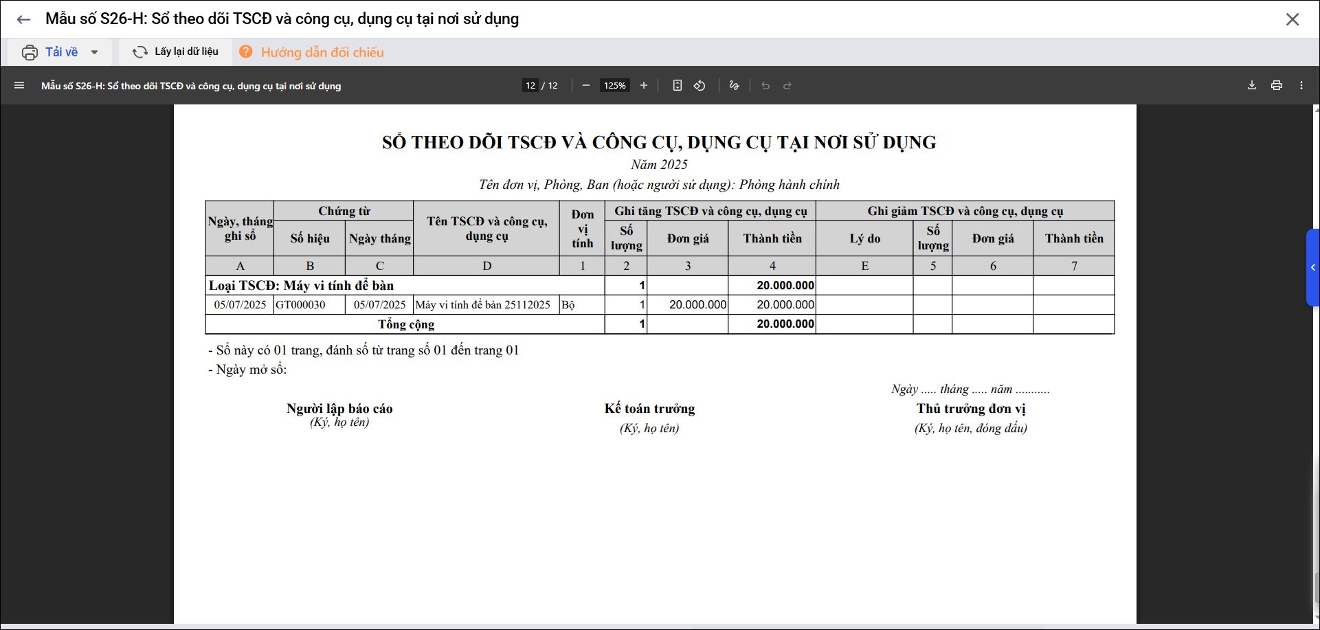 Bài viết này giúp anh/chị in được báo cáo Mẫu số S26-H: Sổ theo dõi TSCĐ và công cụ, dụng cụ tại nơi sử dụng (S26).