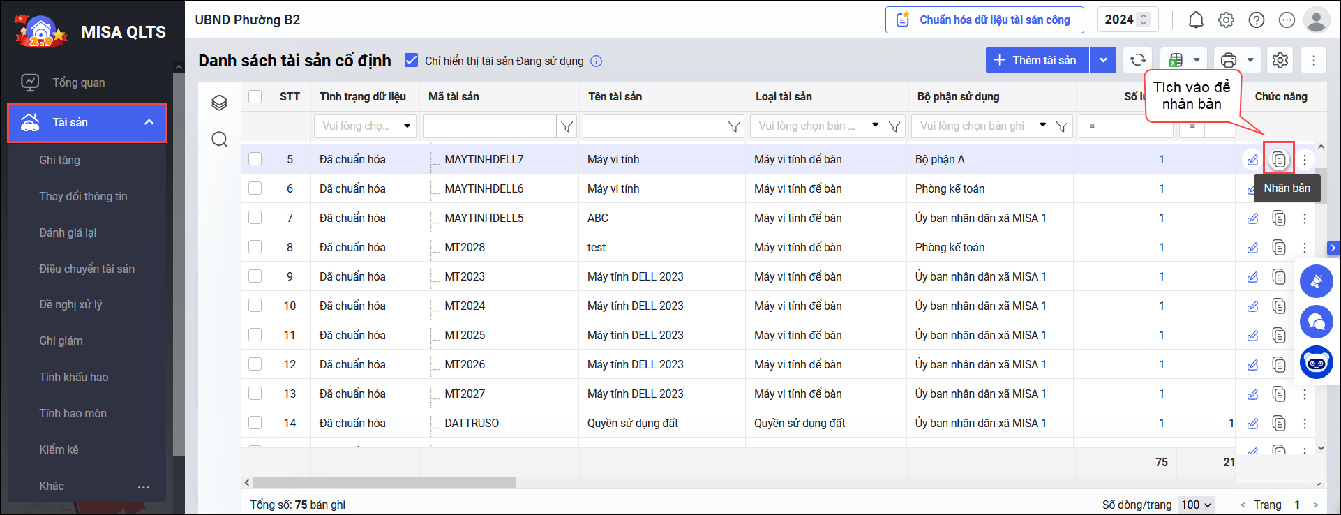 Bước 4: Tích đúp chuột vào mã để sửa lại thông tin đúng, hoặc bấm vào biểu tượng Nhân bản ở cuối dòng để nhân bản lên mã tài sản mới.