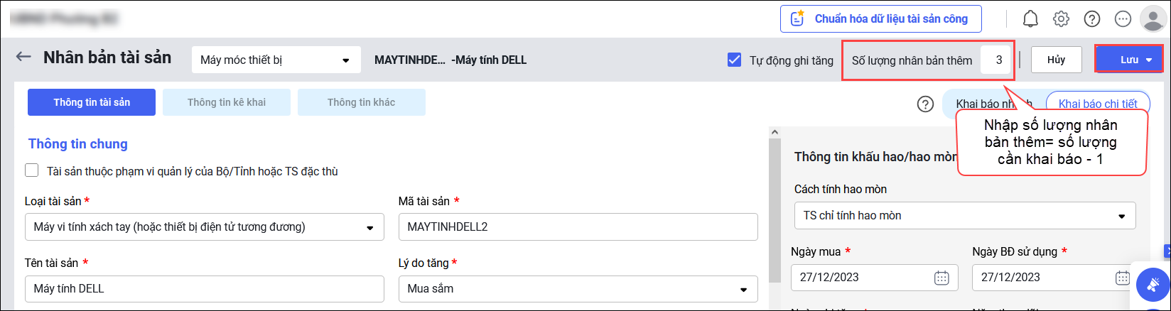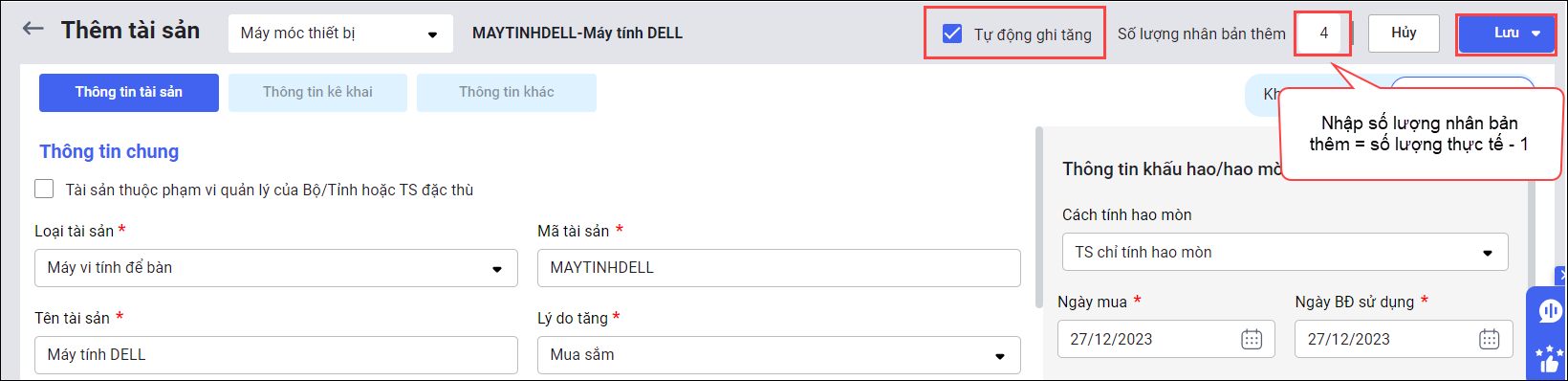 Ví dụ: Cần thêm 4 tài sản giống tài sản hiện có → nhập số lượng nhân bản thêm3