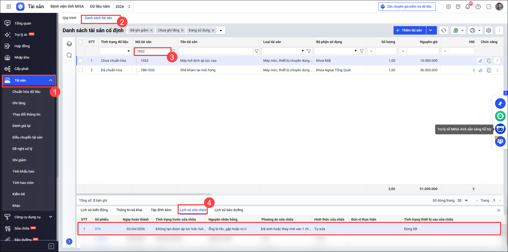 1. Vào Tài sản/Danh sách tài sản. Nhập mã tài sản để thực hiện tìm kiếm nhanh