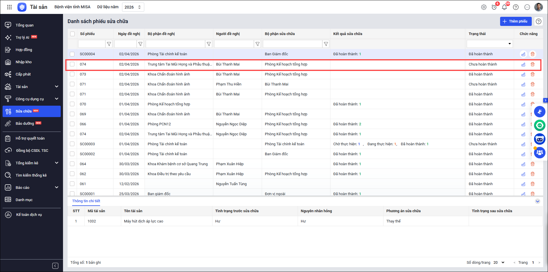 3. Chương trình cũng tự động cập nhật phiếu sửa chữa được khởi tạo từ ứng dụng Quy trình tại mục Sửa chữa/Danh sách phiếu sửa chữa