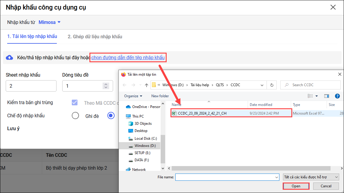 • Nhấn vào Chọn đường dẫn đến tệp nhập khẩu, chọn file CCDC vừa xuất khẩu từ Mimosa được lưu trong máy tính, nhấn Open.
