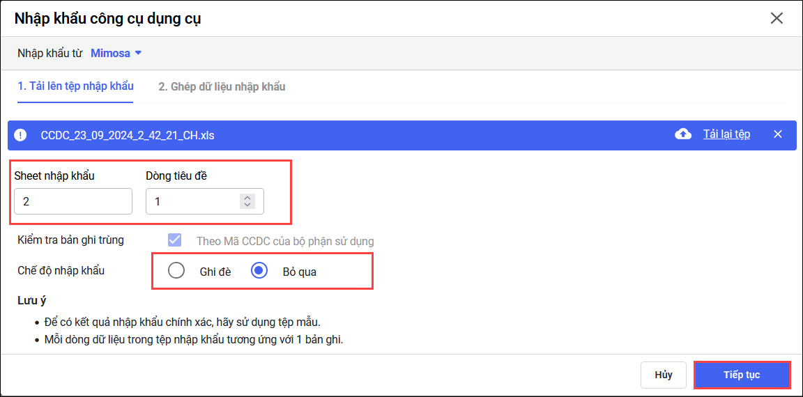 • Chọn sheet nhập khẩu tương ứng với sheet mà anh/chị đã khai báo danh sách CCDC. Chọn số dòng tiêu đề.