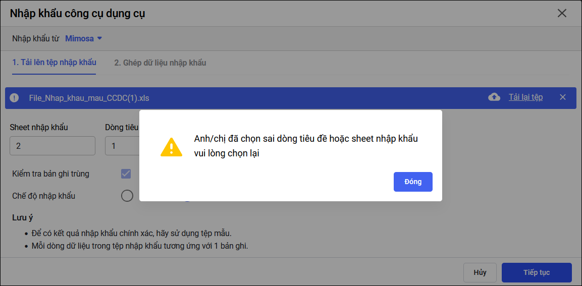 Lưu ý: Anh/chị cần chọn đúng file chứa dữ liệu CCDC được xuất khẩu ra từ phần mềm MISA Mimosa, nếu không chọn đúng tệp được xuất khẩu từ MISA Mimosa, hệ thống sẽ hiển thị thông báo như sau: