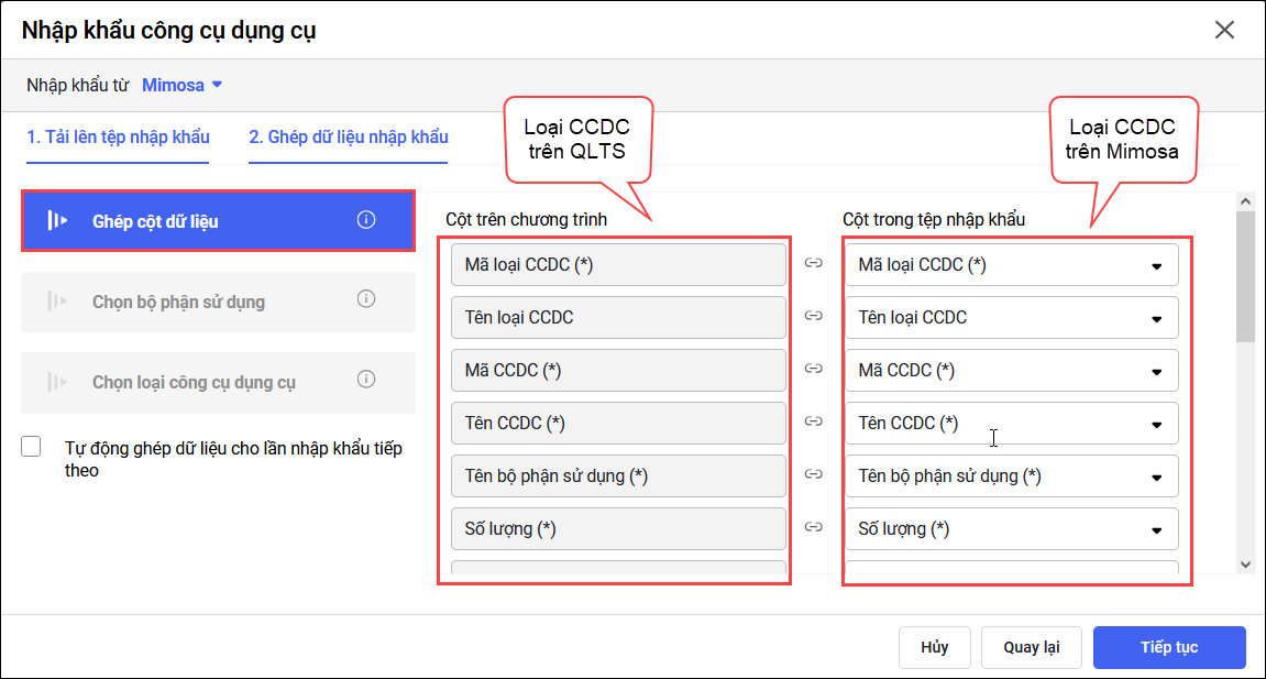 • Anh/chị ghép bộ phận sử dụng CCDC trên file nhập khẩu tương ứng với các bộ phận sử dụng trong danh mục.