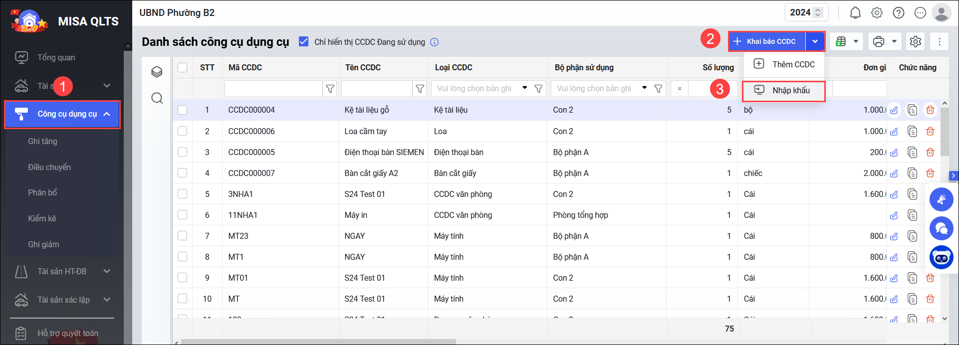2.5: Nhấn Nhập khẩu để nhập khẩu CCDC vào phần mềm.