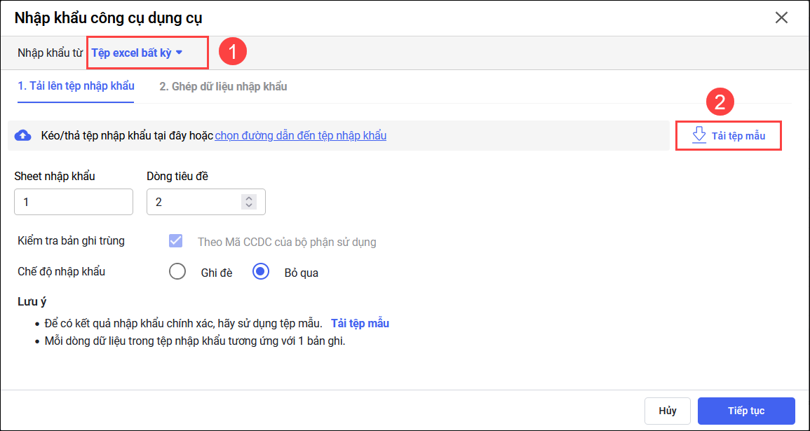 - Khi chọn Nhập khẩu từ Tệp excel bất kỳ, để có kết quả nhập khẩu chính xác, bạn cần Tải tệp mẫu.