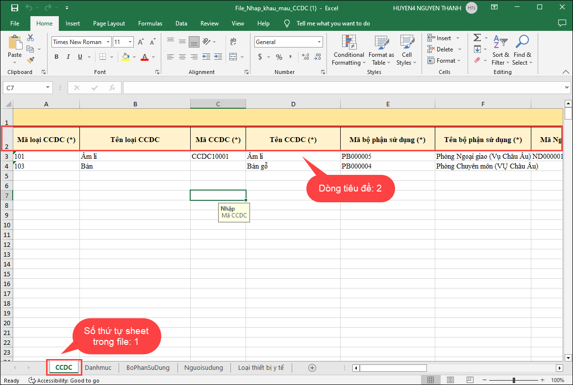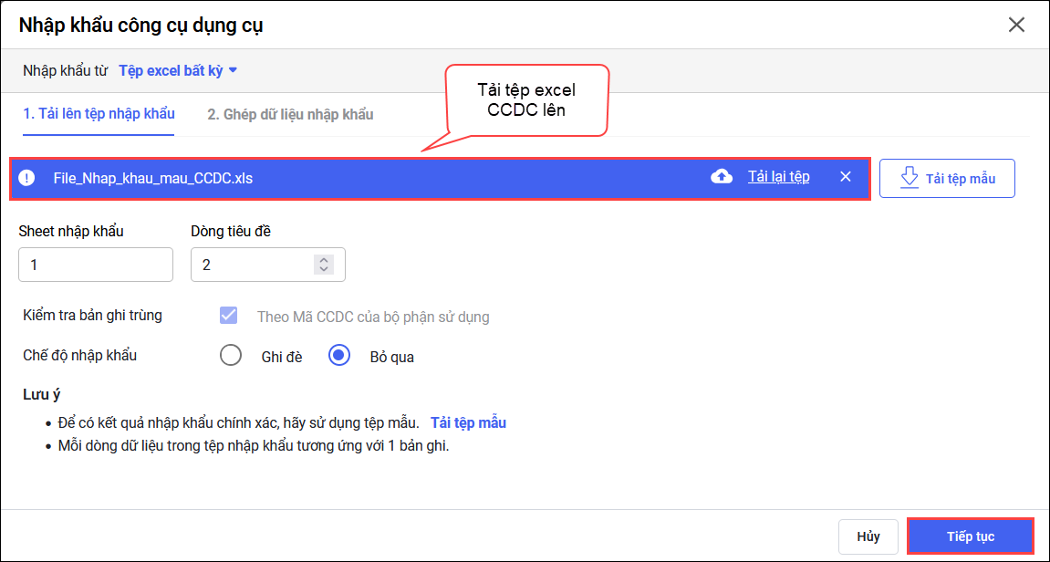 Lưu ý: Chọn Sheet nhập khẩu và Dòng tiêu đề tương ứng với sheet mà bạn đã khai báo danh sách CCDC. mặc định thường là 2