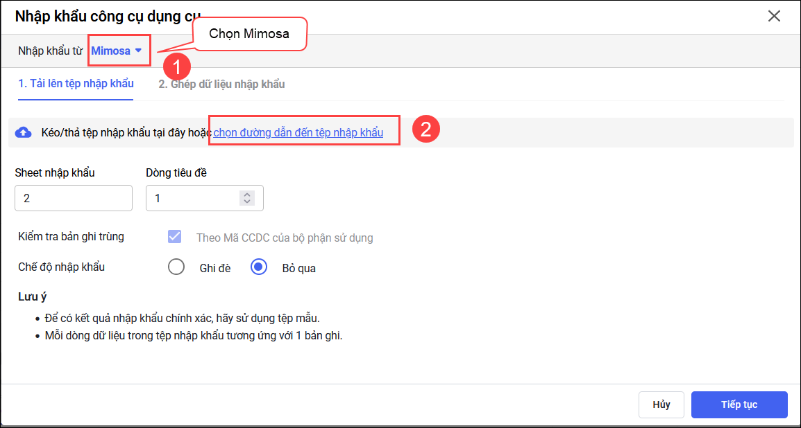 - Chọn Nhập khẩu từ Mimosa.