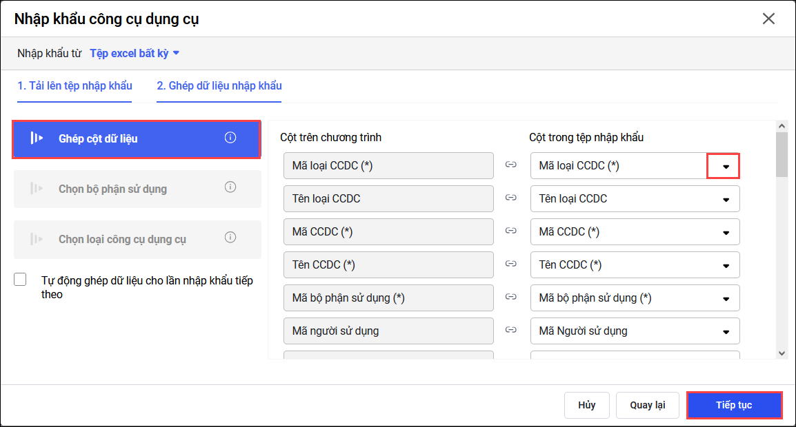 2.1: Tại phần Ghép cột dữ liệu cho phép bạn tự thực hiện ghép các cột dữ liệu trên file excel tương ứng với các thông tin của CCDC trên phần mềm.