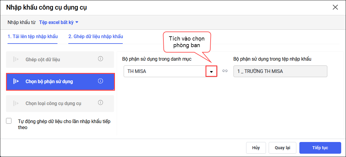 2.2: Tại phần Chọn bộ phận sử dụng, phần mềm tự động ghép bộ phận sử dụng CCDC được khai báo trên tệp nhập khẩu tương ứng với các bộ phận sử dụng trong danh mục. Có thể chỉnh sửa nếu muốn.