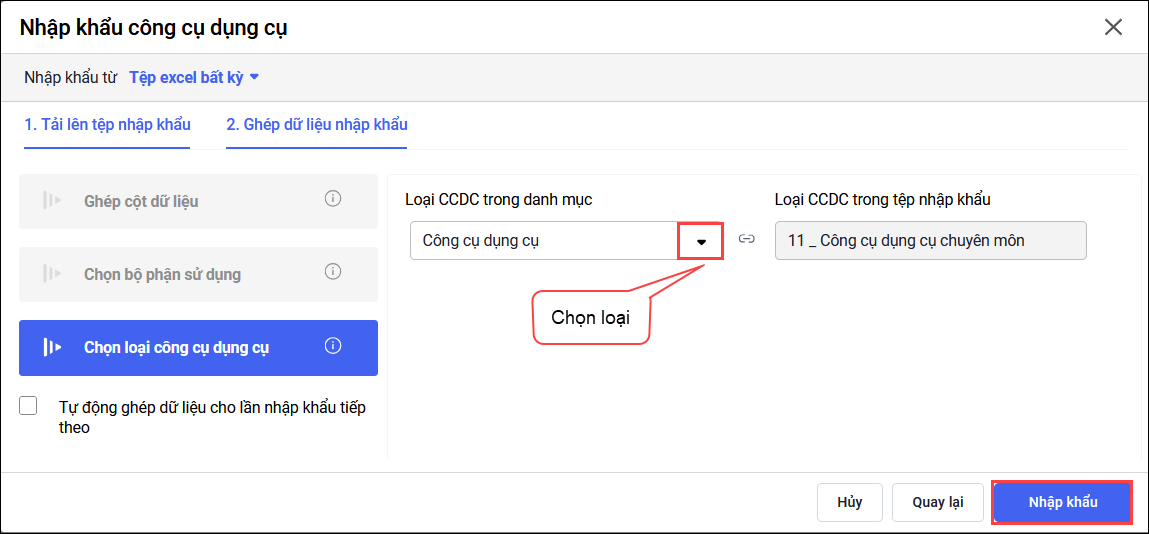 2.3: Tại phần Chọn loại công cụ dụng cụ, phần mềm tự động ghép loại CCDC được khai báo trên tệp nhập khẩu tương ứng với loại CCDC trong danh mục. Có thể chỉnh sửa nếu muốn.