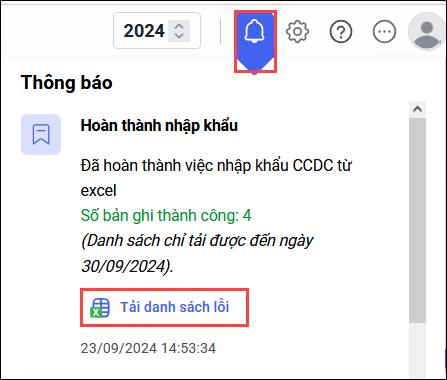 Sau khi nhấn Đóng, anh/chị chờ trong giây lát để hệ thống xử lý. Khi có thông báo tại biểu tượng chuông ở góc trên bên phải, kết quả nhập khẩu sẽ hiển thị với 2 trường hợp: