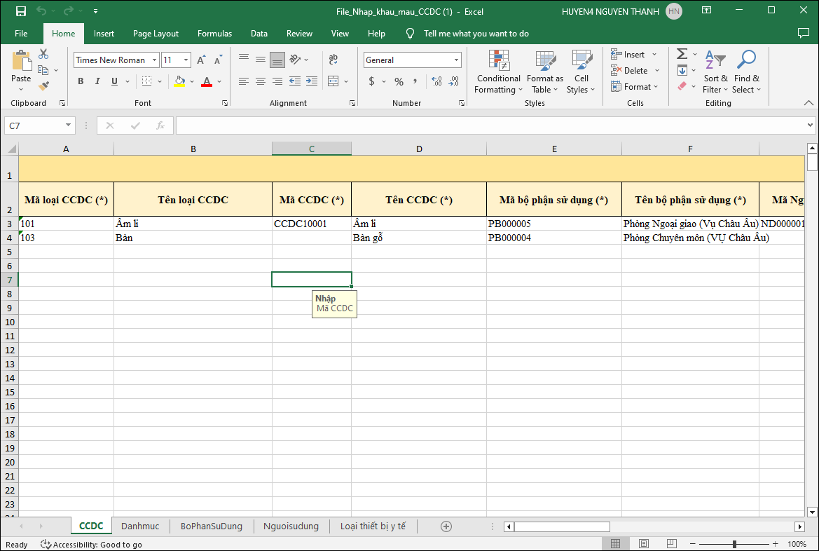 3.6. Tải file mẫu nhập khẩu CCDC nhưng không thấy thông tin mã bộ phận sử dụng và người sử dụng để chọn