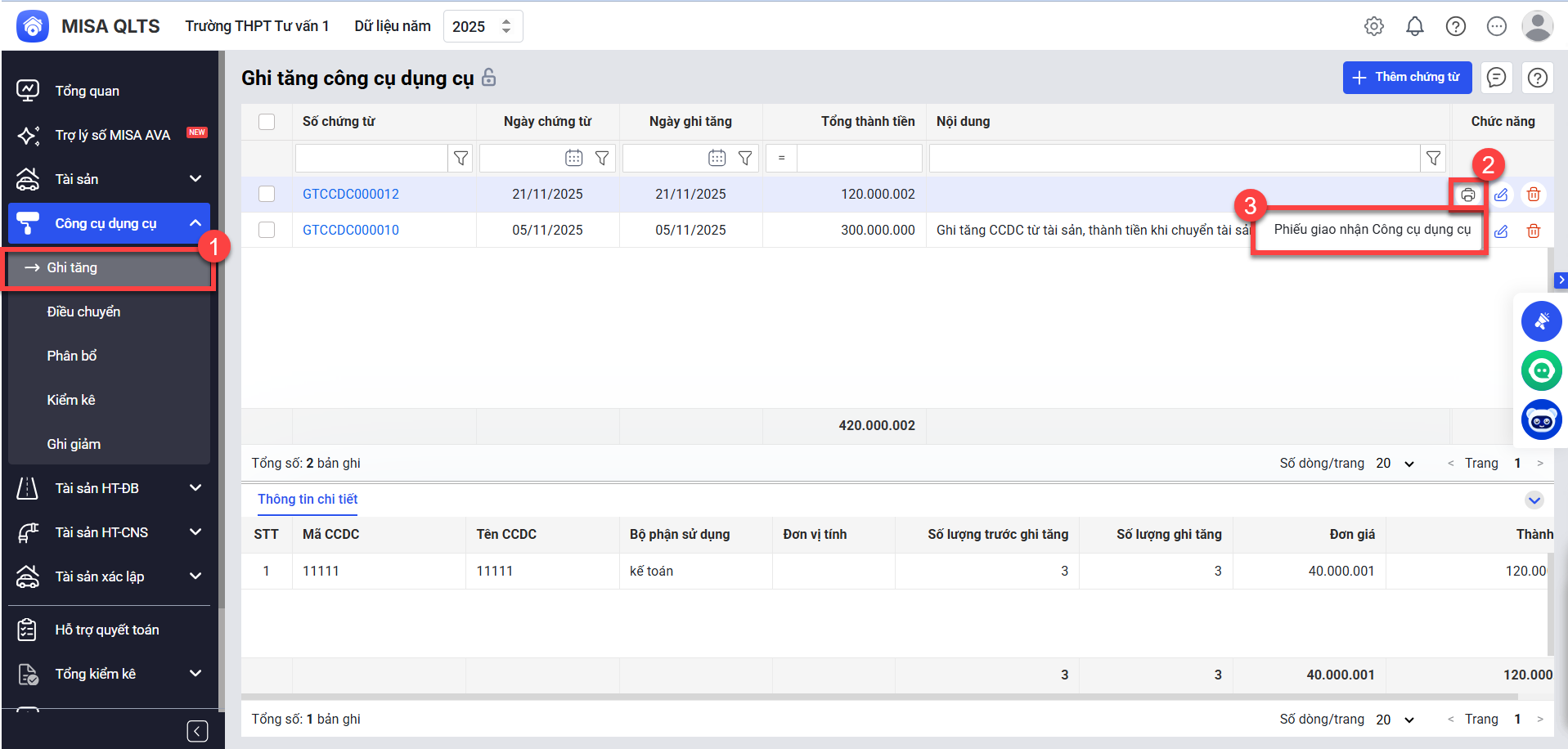 Bước 2: Tại màn hình ghi tăng CCDC, anh chị chọn chứng từ cần in Phiếu giao nhận công cụ dụng cụ, sau đó nhấn vào biểu tượng In chọn Phiếu giao nhận công cụ dụng cụ.
