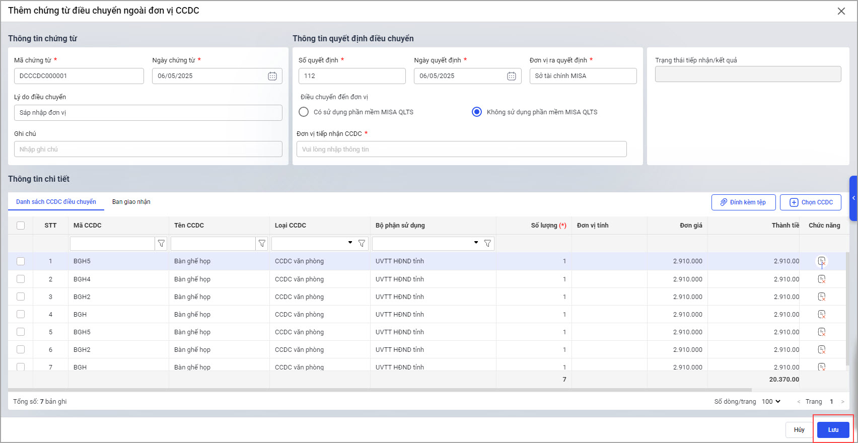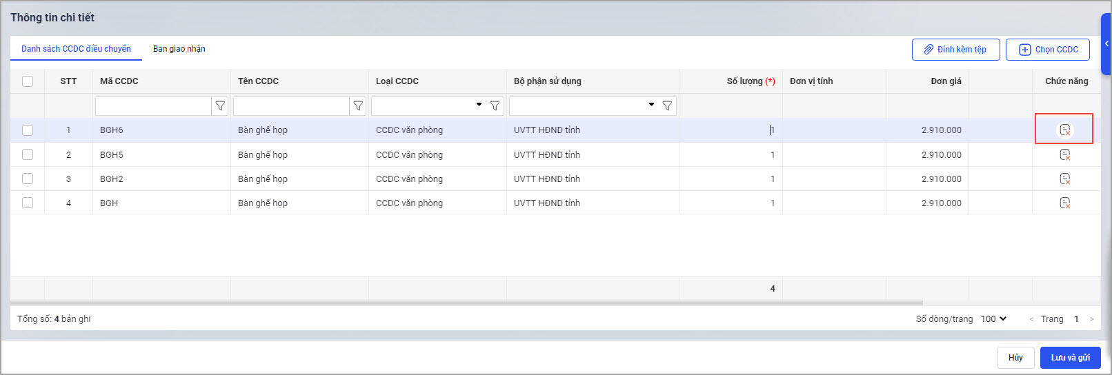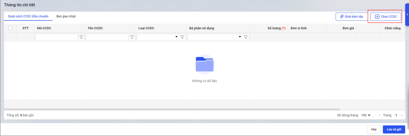 • Tại Thông tin chi tiết\Danh sách CCDC. điều chuyển: