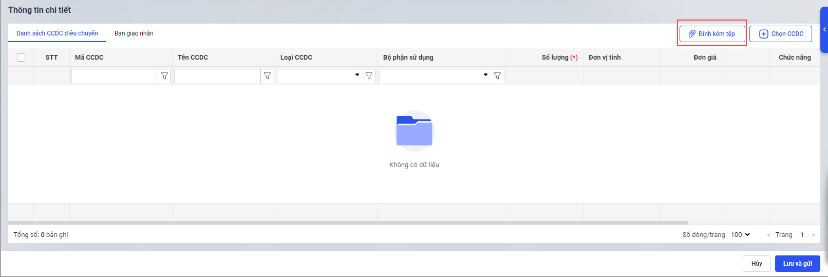 • CCDC được chọn hiển thị ở mục Danh sách CCDC điều chuyển. Anh/chị có thể đính kèm tài liệu, văn bản liên quan hoặc xóa CCDC khỏi chứng từ.