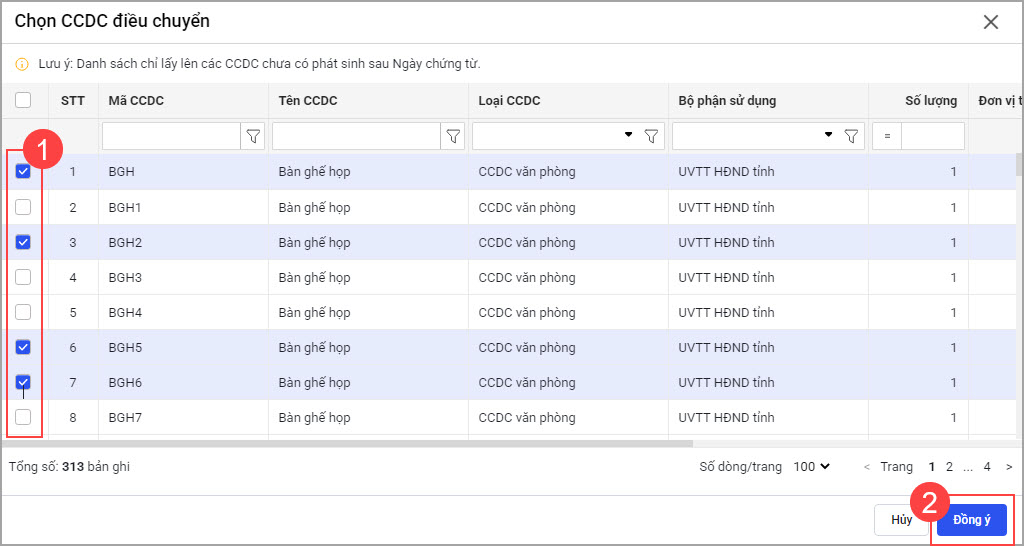 • Tích chọn một hoặc nhiều CCDC cần điều chuyển. Lưu ý: Danh sách CCDC chỉ lấy lên các CCDC chưa có phát sinh sau Ngày điều chuyển, nhấn Đồng ý.
