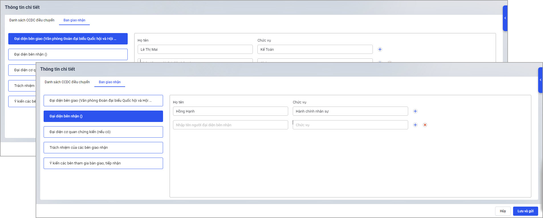 • Đại diện bên giao, Đại diện bên nhận, Đại diện cơ quan chứng kiến (nếu có): Bao gồm các thông tin: Họ tên; Chức vụ.
