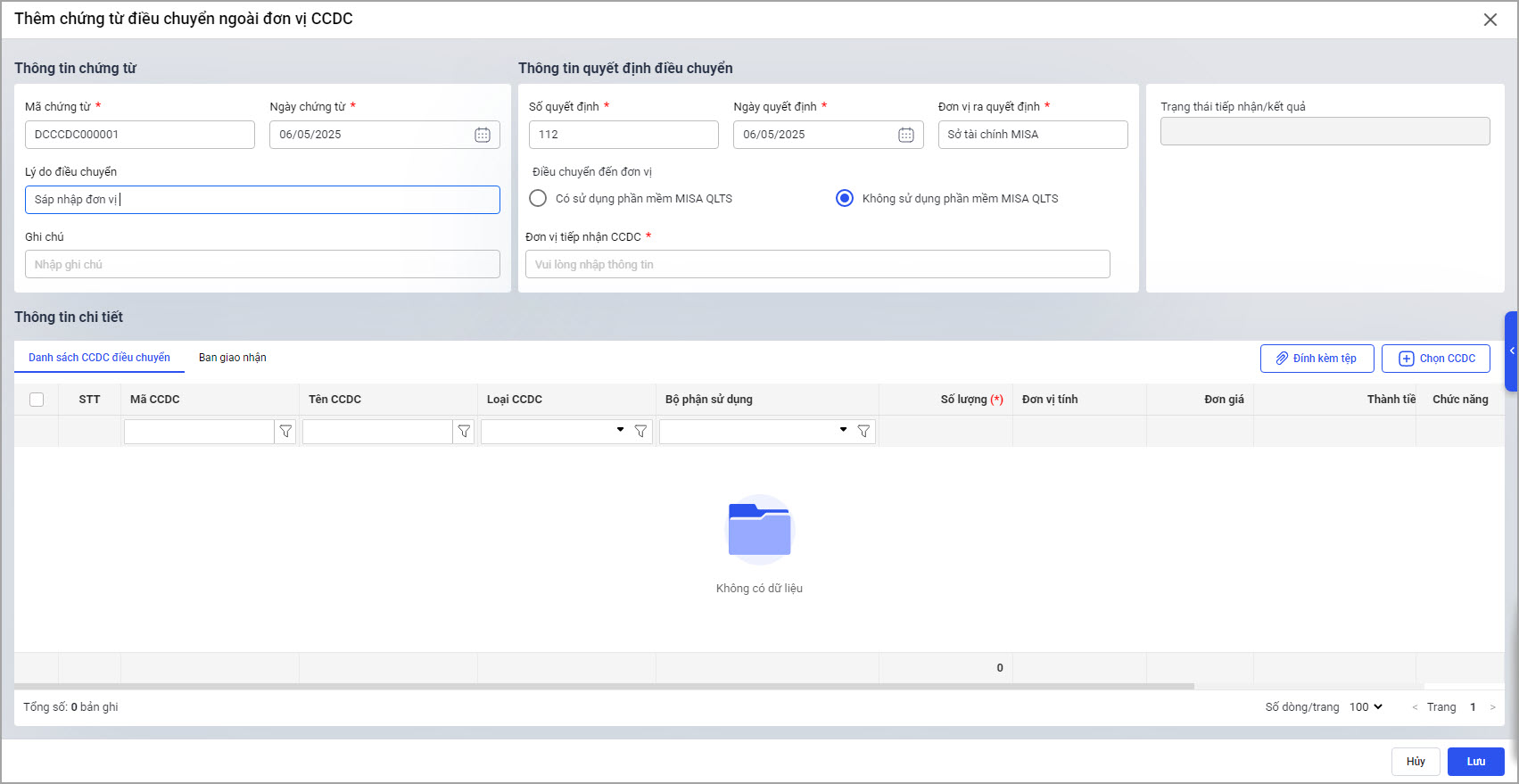 Khi sáp nhập đơn vị, anh/chị cần thực hiện điều chuyển công cụ, dụng cụ (CCDC) sang đơn vị khác không sử dụng phần mềm IHos Tài sản.