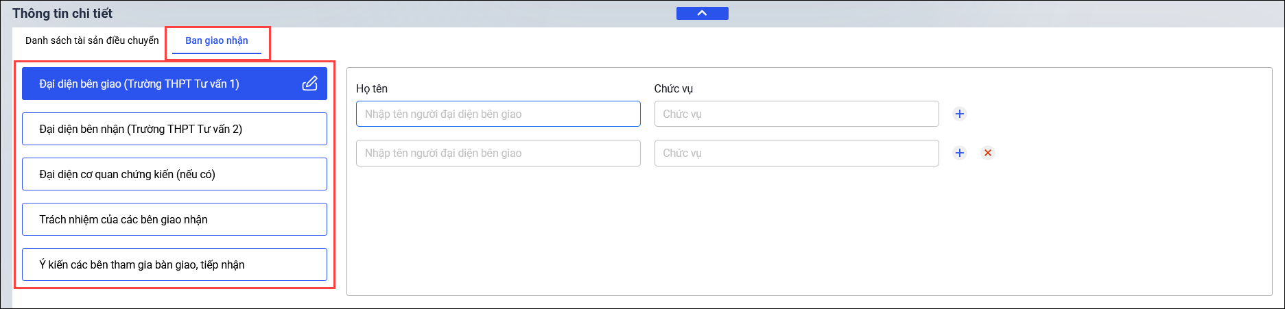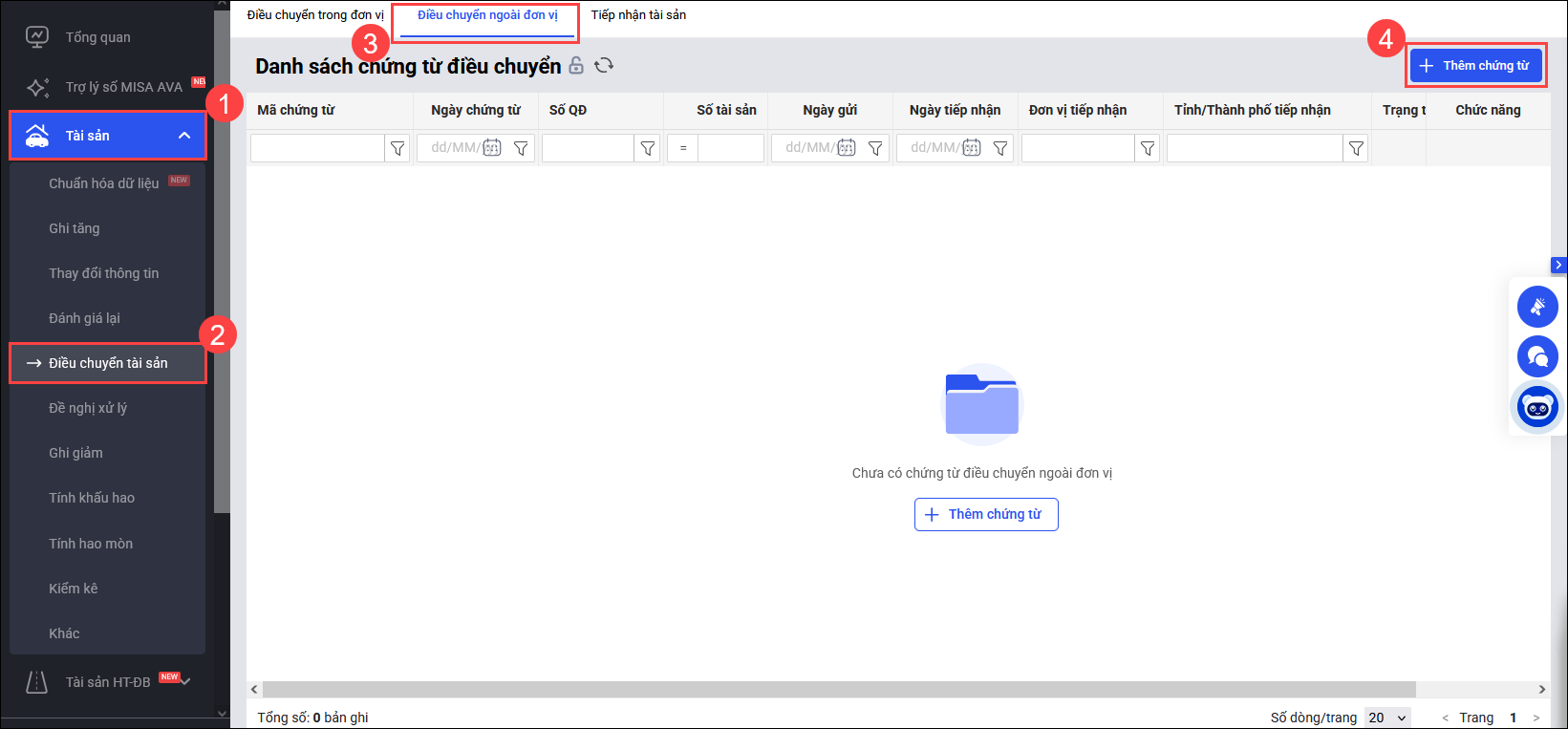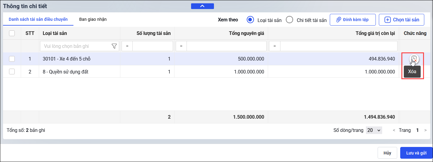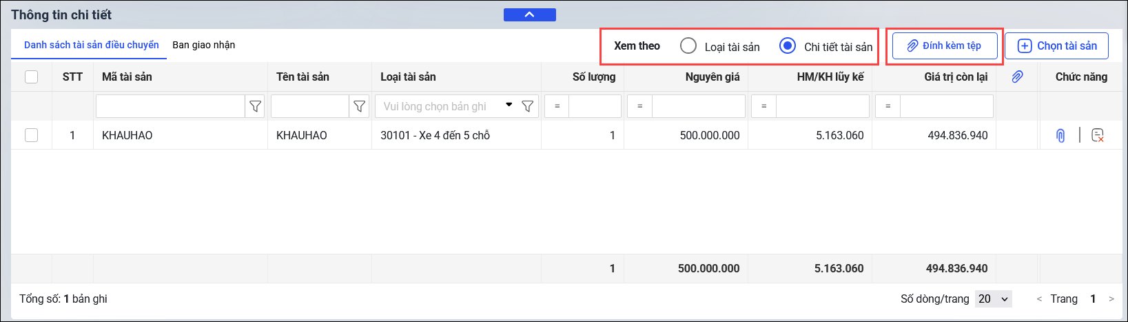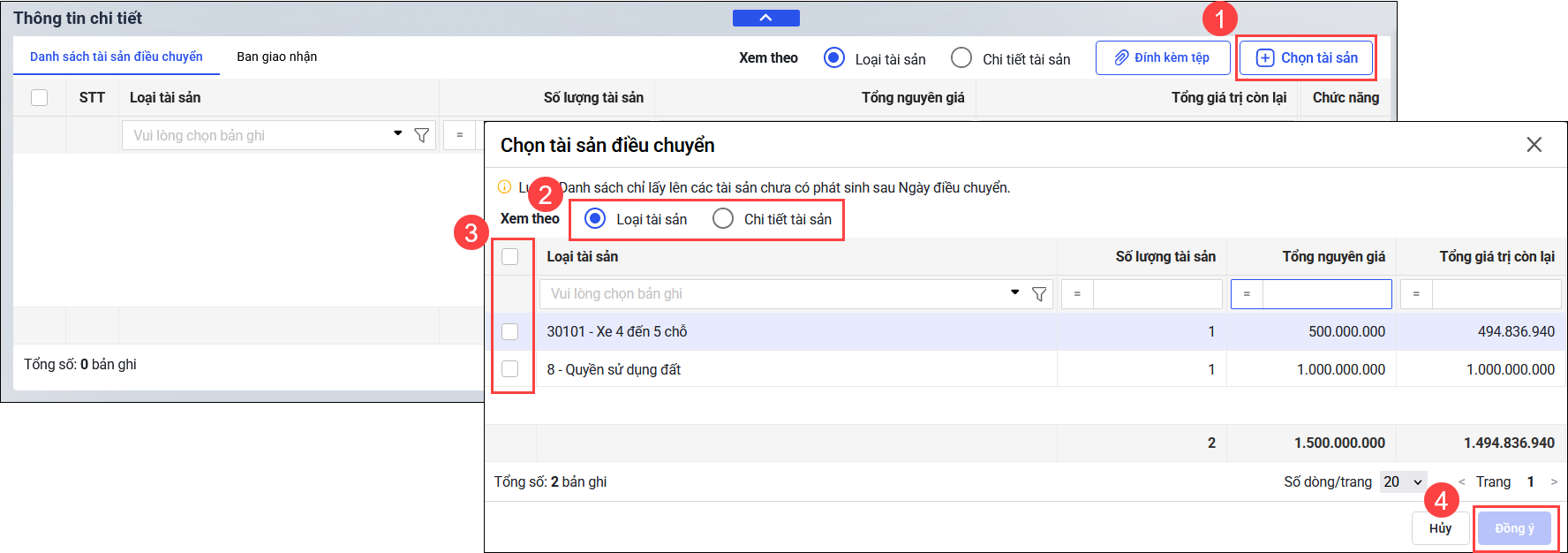 - Lựa chọn danh sách tài sản cần điều chuyển.
